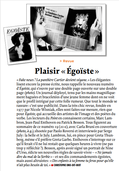 Les photographes et les écrivains les plus marquants de leur époque (Helmut Newton, Richard Avedon, Guy Bourdin) auront nourri les 16 numéros parus à ce jour avec une périodicité capricieuse. Egoïste est le dictionnaire subjectif d'une époque. Connu pour la magie de sa maquette, ses images mythiques comme le nu de Yannick Noah par Avedon ou le portrait d'Ava Gardner par Helmut Newton et ses publicités sur mesure conçues et réalisées spécialement par Nicole Wisniak, Egoïste a offert un espace de créativité aux grands écrivains tels que Françoise Sagan, Jean d'Ormesson, Bernard Frank. La sortie d'Egoïste constitue toujours un événement salué par la presse internationale. Chaque numéro est collectionné avec passion par de nombreux amateurs.